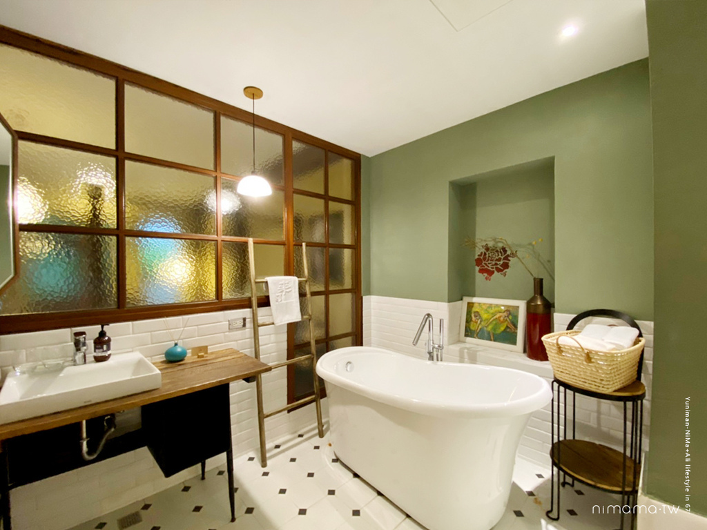 還有很大的衛室、有浴缸有乾濕分離,格子花玻木窗是不是很有味道、唯一覺得格格不入的是綠牆上的紅玫瑰跟花瓶、個人沒有很喜歡