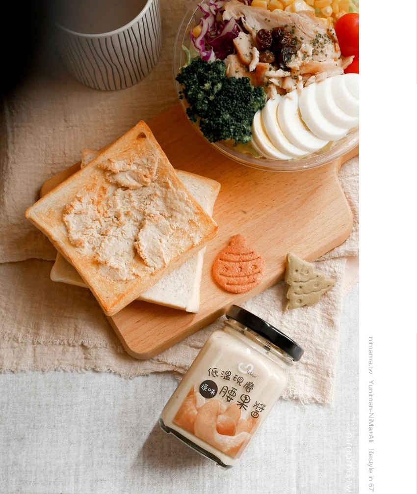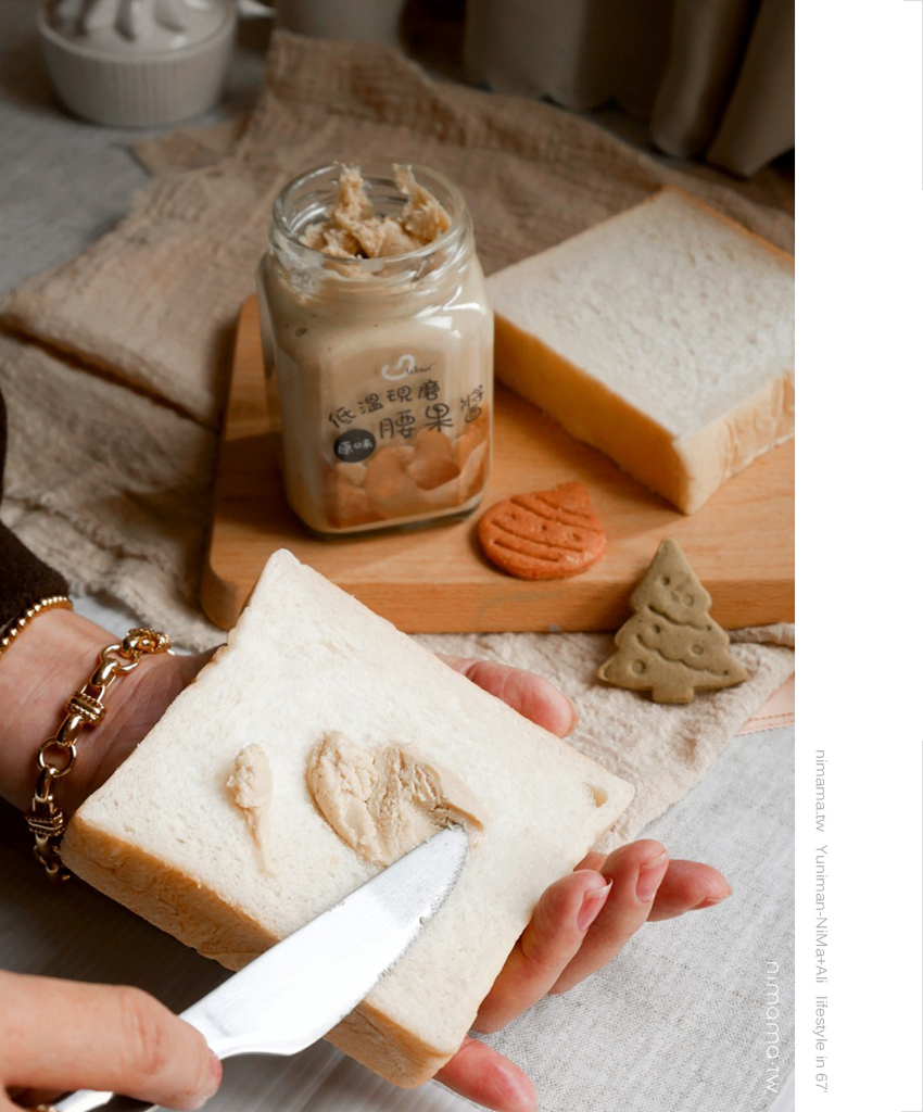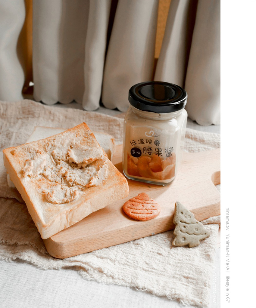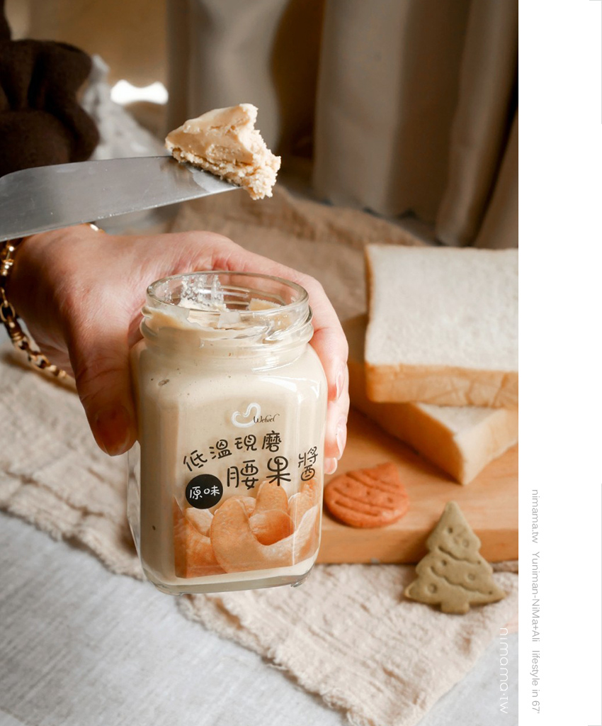 Welwel的腰果醬只能說真的是100%的純,單吃就好比在吃腰果被壓得很細緻的口感般,婗媽太好奇怎麼會純到一滴油都沒有😂感覺像是被榨乾的腰果醬,因為要塗在吐司中好難推開呀!詢問之下才知道這批不算是正常版,因此他們會再調整回原本好抹開的配方!
