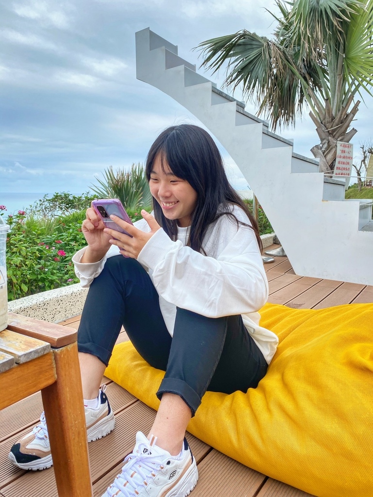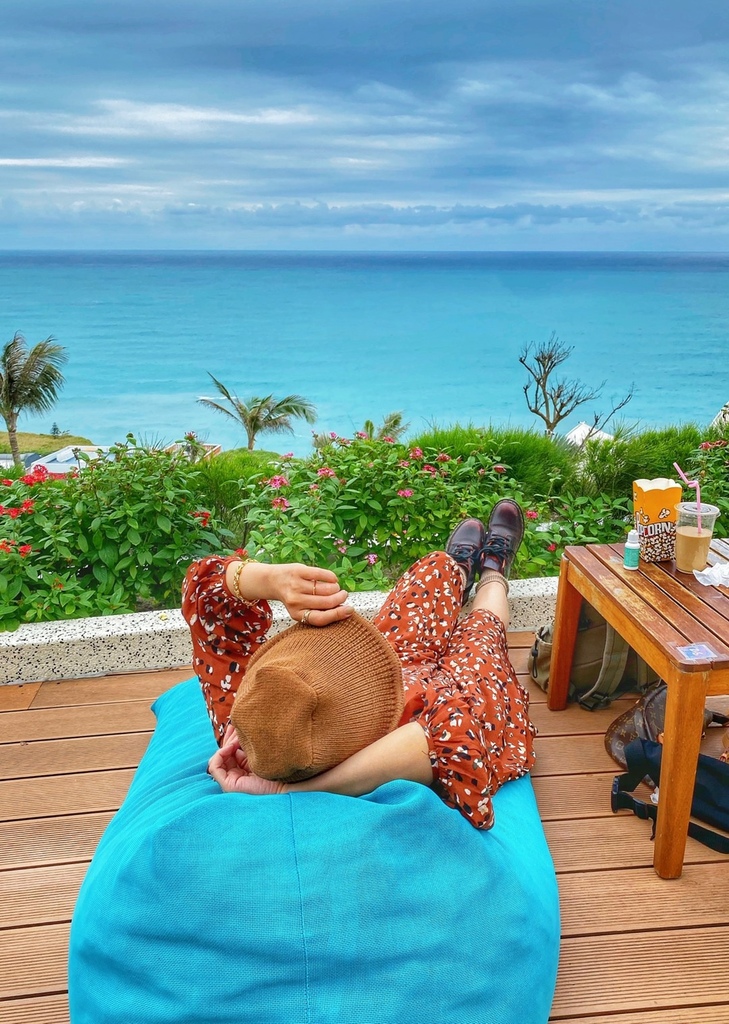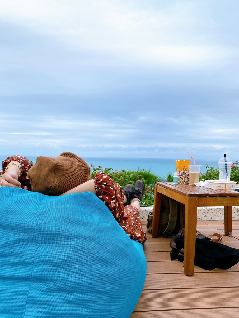 海崖谷其實比較適合秋冬季節,如果是春夏會覺得太熱了,在外面一定待不住,反而可惜可以躺在這裡享受美景的機會,因此、我們在剛好的氣候,才能這樣慵懶地躺在這裡聽海浪拍打、看著天空、綻藍海邊,超級舒服的啊~加上當天人不多不少的剛剛好才能夠躺在自己覺得最優秀的位置、是不是很幸運呢!
